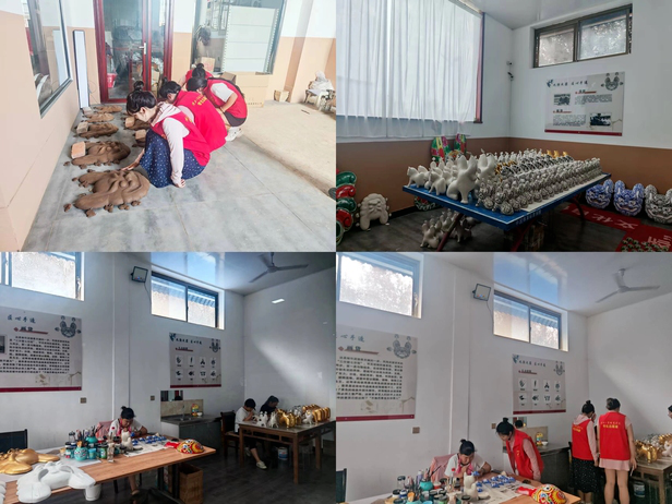 实践团首站走进国家级非遗项目凤翔泥塑代表性传承人胡新明的工作室,泥土与颜料的独特气息扑面而来,展架上形态各异的泥塑作品生动传神—人物情态鲜活、动物姿态灵动,无不承载着深厚的关中民俗文化记忆。同学们近距离观摩泥塑制作全过程,系统学习“挖土、砸泥、捏货、合货、洗货、缝货、画货、妆货、漆货”等传统工序,亲手体验从泥土塑形到彩绘点睛的匠心技艺,在实践中深入理解每道工序承载的民俗智慧与匠人精神。