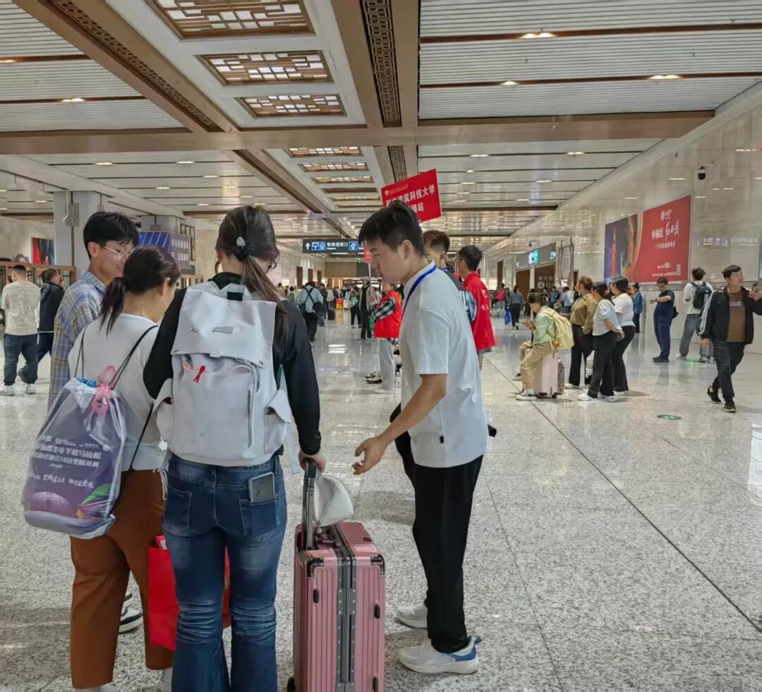 志愿者早早在火车站出口设点,醒目“校园迎新指引牌”亮眼。指引传关怀,助初到新生卸下紧张,留存初见温暖。